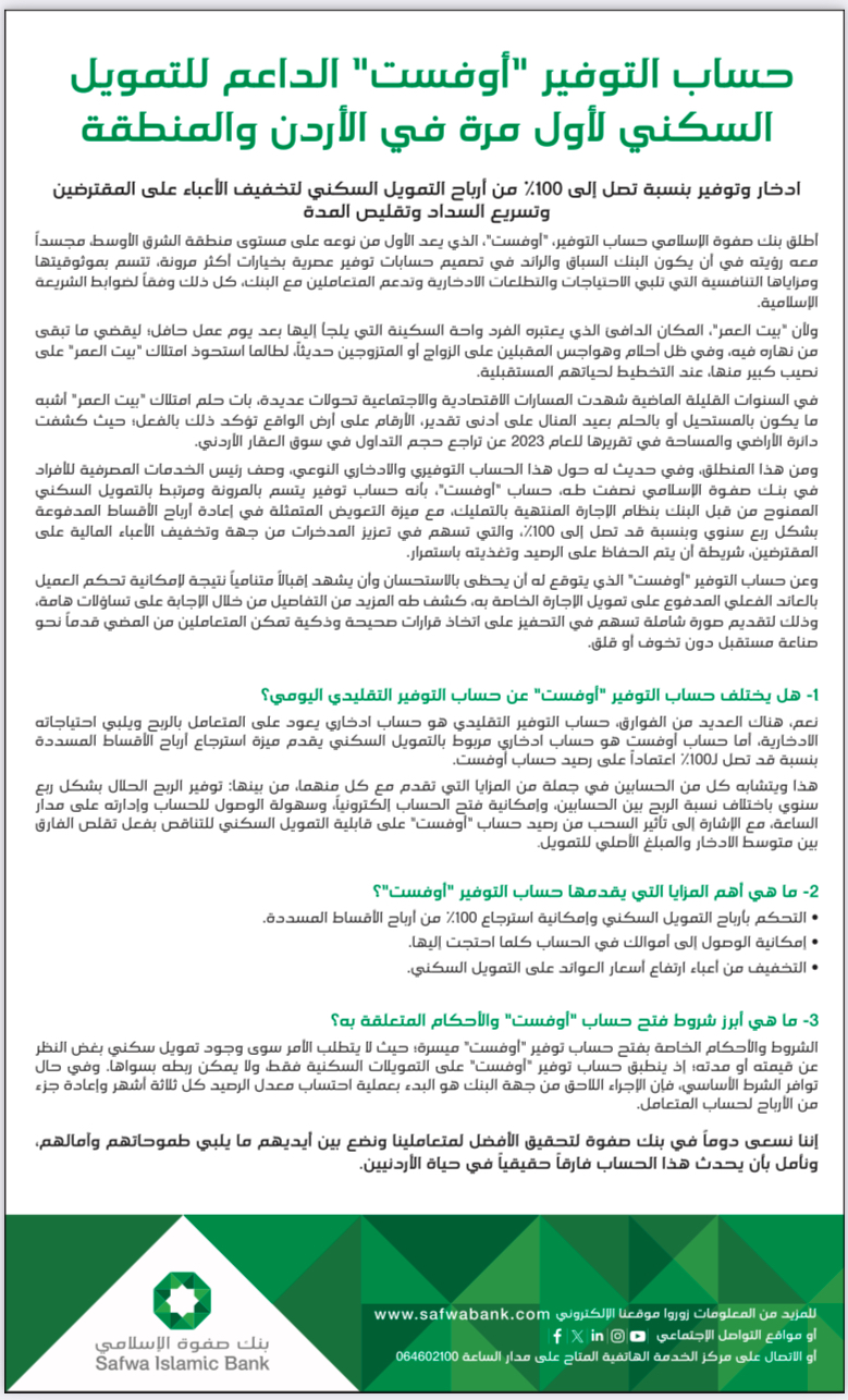 سرايا - ادخار وتوفير بنسبة تصل إلى 100% من أرباح التمويل السكني لتخفيف الأعباء على المقترضين وتسريع السداد وتقليص المدة أطلق بنك صفوة الإسلامي حساب التوفير، "أوفست"، الذي يعد الأول من نوعه على مستوى منطقة الشرق الأوسط، مجسداً معه رؤيته في أن يكون البنك السباق والرائد في تصميم حسابات توفير عصرية بخيارات أكثر مرونة، تتسم بموثوقيتها ومزاياها التنافسية التي تلبي الاحتياجات والتطلعات الادخارية وتدعم المتعاملين مع البنك، كل ذلك وفقاً لضوابط الشريعة الإسلامية.