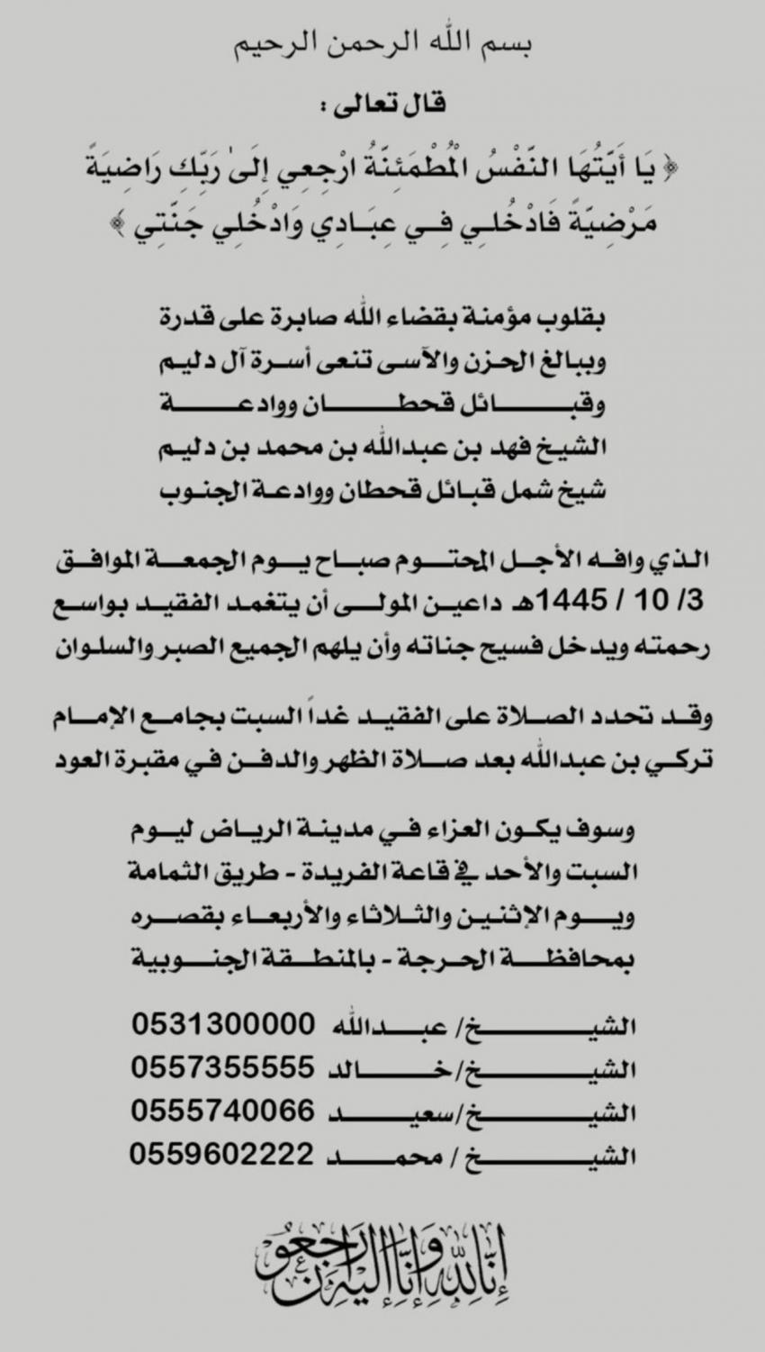 سرايا - توفي الشيخ فهد بن عبدالله بن دليم، شيخ شمل قبائل قحطان ووادعة في المملكة العربية السعودية، أمس الجمعة، بعد صراع مع المرض.