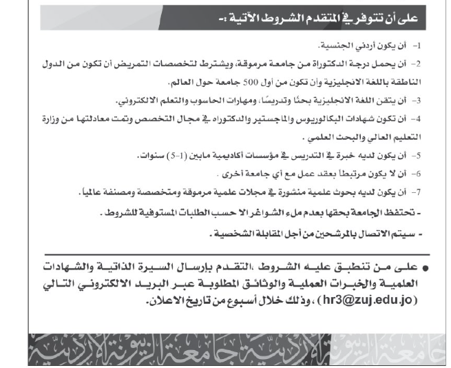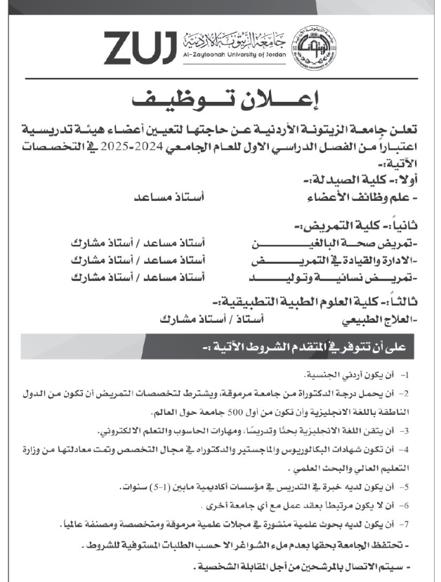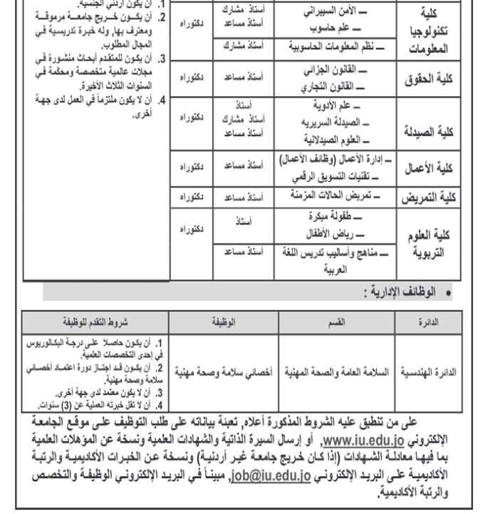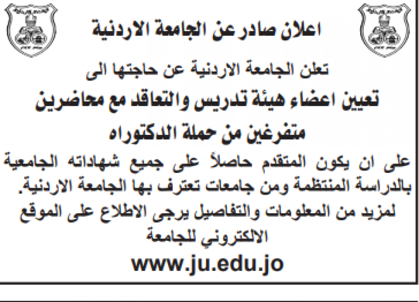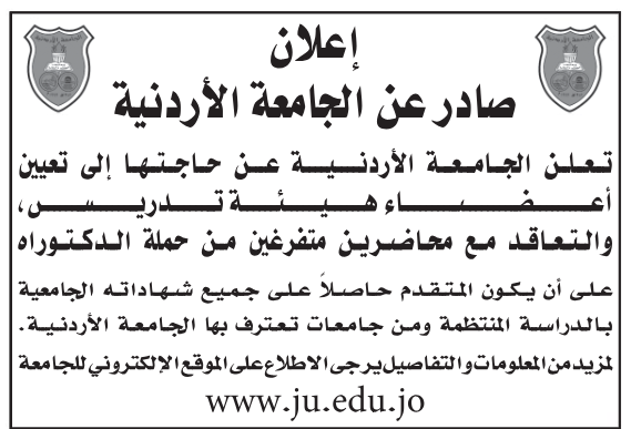 سرايا - أعلنت الجامعة الأردنية عن حاجتها الى تعيين اعضاء هيئة تدريس ومحاضرين متفرغين من حملة شهادة الدكتوراة.وكما دعت مؤسسات حكومية آخرين لإجراء المقابلات الشخصية لغايات استكمال اجراءات التعيين.وتاليا الأسماء والتفاصيل: