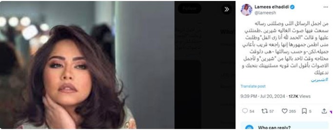 كتبت لميس الحديدي عبر حسابها بموقع Twitter: "من اجمل الرسائل اللى وصلتنى رساله سمعت فيها صوت الغاليه شيرين . طمنتني عليها و قالت "الحمد لله أنا زى الفل"وطلبت منى اطمن جمهورها إنها راجعه قريب بأغاني جميله،لكن-و حسب رسالتها -هى دلوقت محتاجه وقت تاخد بالها من "شيرين"و لأجمل الاصوات بأقول انت قويه مستنيينك بنحبك و ندعيلك".