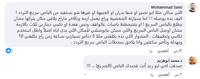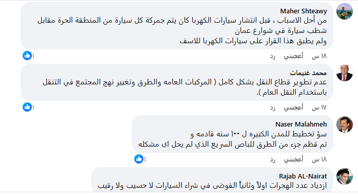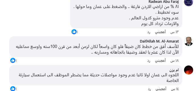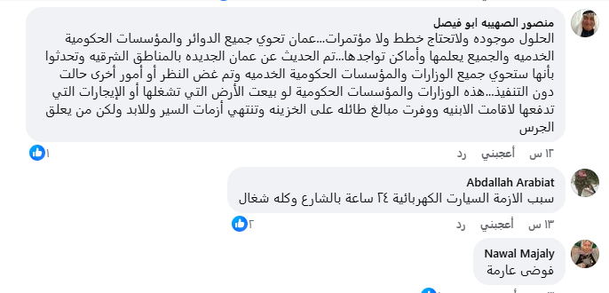 وقال الحراكي والناشط فلاح الخلايلة في تعليق له على منشور الخالدي :" هي ازمة تقاطعات ابو زيد ونحتاج إلى ثلاثة مليارات دينار اردني لحل أزمة التقاطعات في المرحلة الأولى وبدك تحسب من المبلغ استملاكات اكثر من 500 مليون دينار غير هيك مافي حل لازمة المرور".