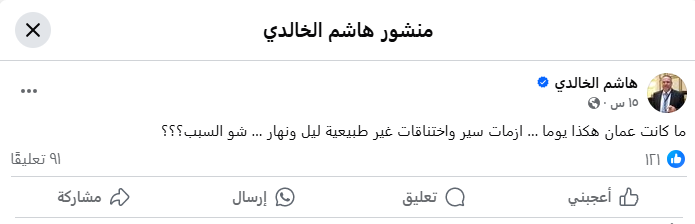 سرايا - رصد - حظي منشور نشره الزميل الصحفي هاشم الخالدي عبر منصة التواصل الاجتماعي "فيسبوك" بتفاعل كبير من المواطنين، حيث تناول فيه قضية الازدحامات المرورية الخانقة التي تشهدها العاصمة عمّان في الآونة الأخيرة.