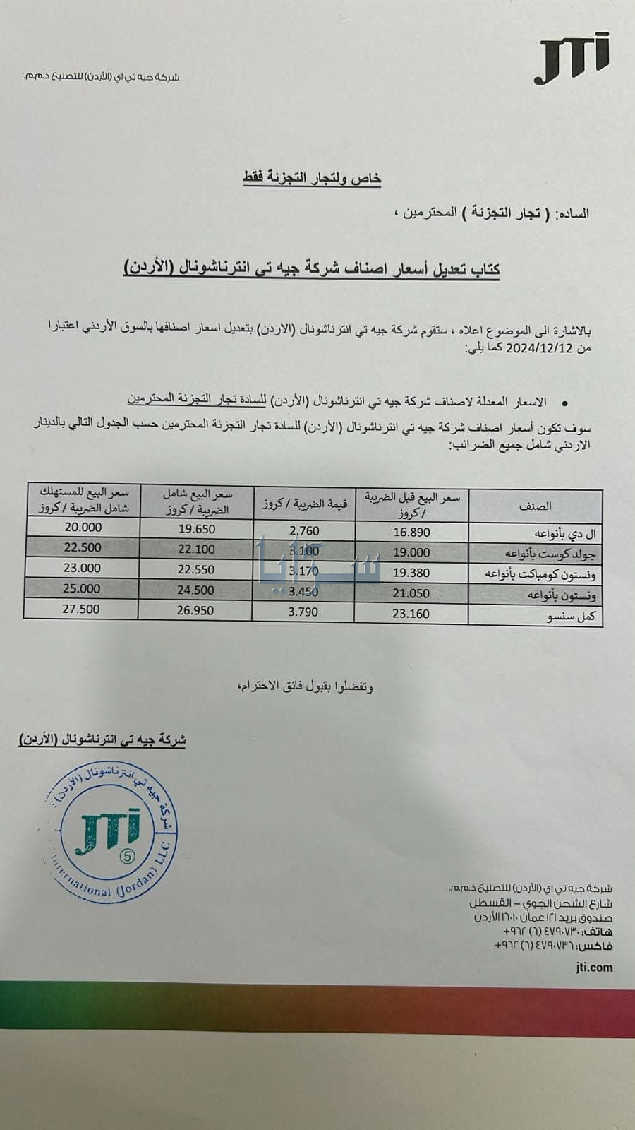 سرايا - قررت شركة جي تي انترناشونال (الأردن) ب رفع اسعار أصنافها (الدخان) بالسوق الأردني اعتبارا من تاريخ 12 / 12 / 2024 ل تجار التجزئة.