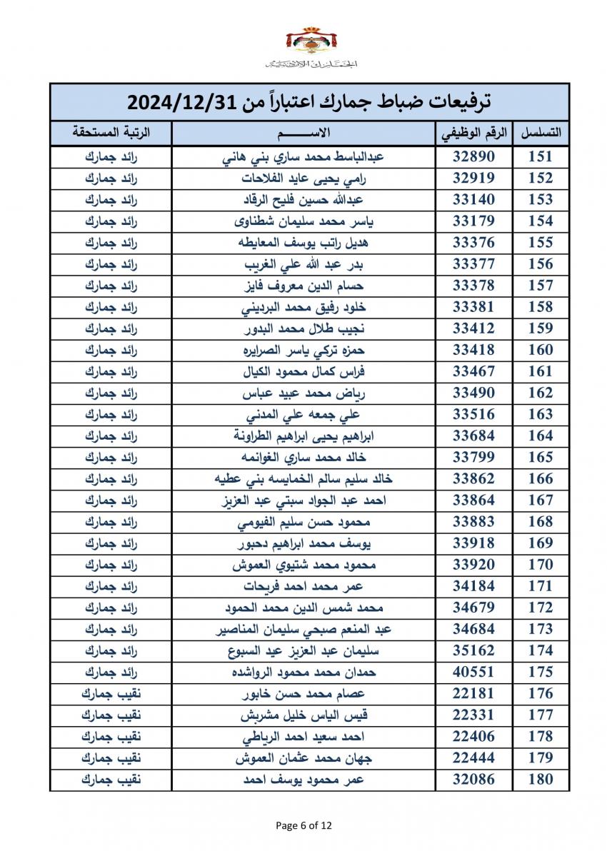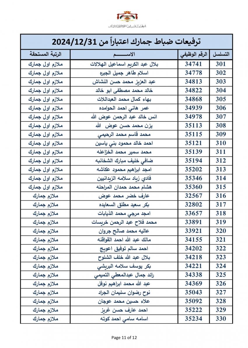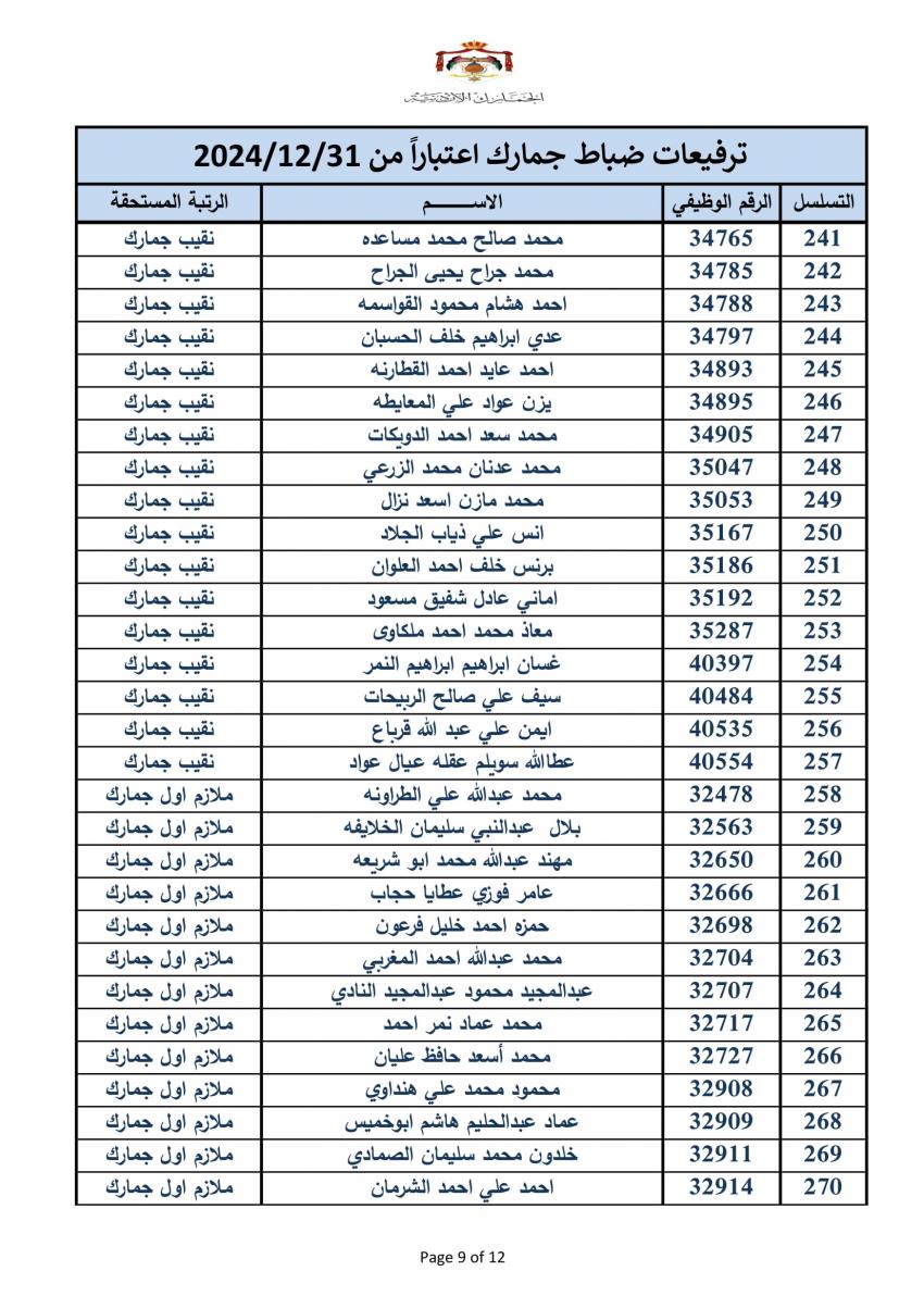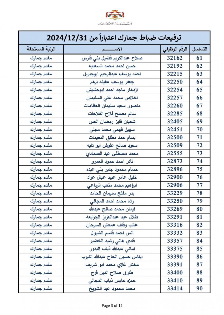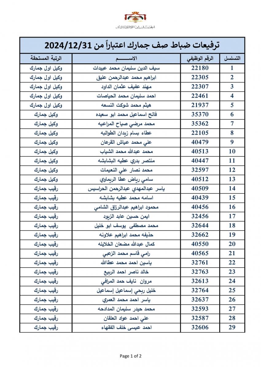 سرايا - أعلنت دائرة الجمارك الأردنية مساء اليوم الخميس، ترفيع 340 ضابطا، وعدد من ضباط الصف والافراد.