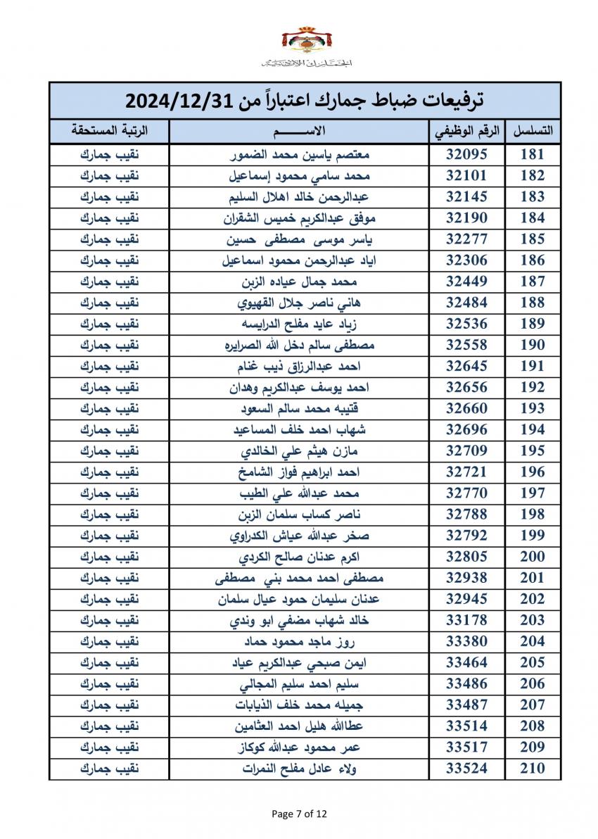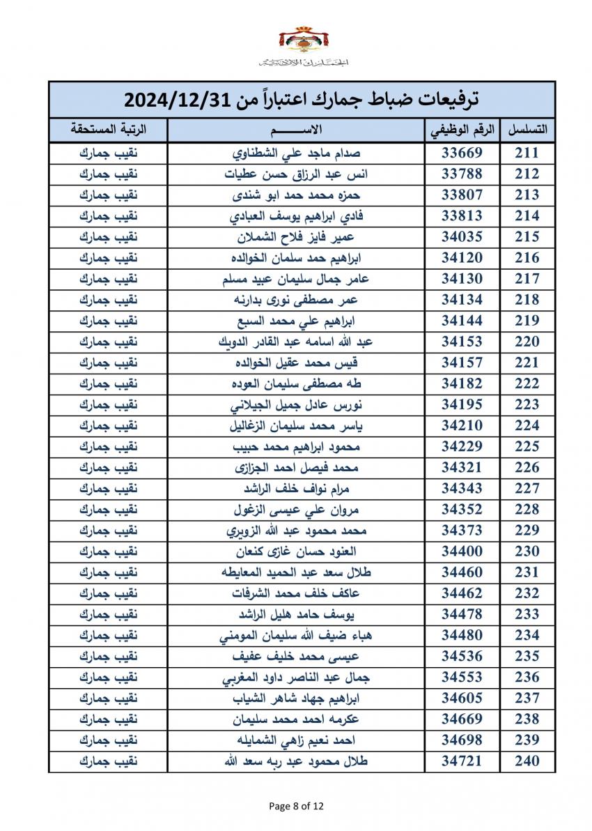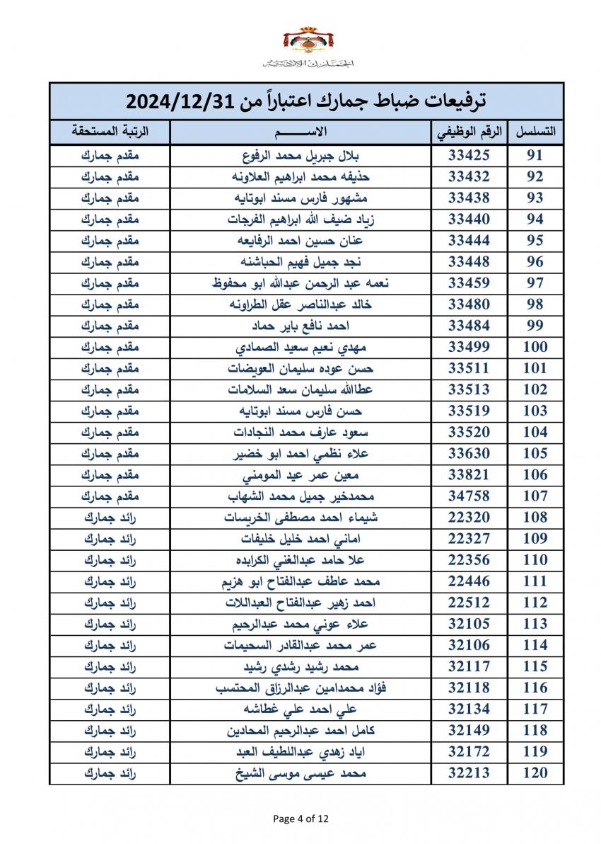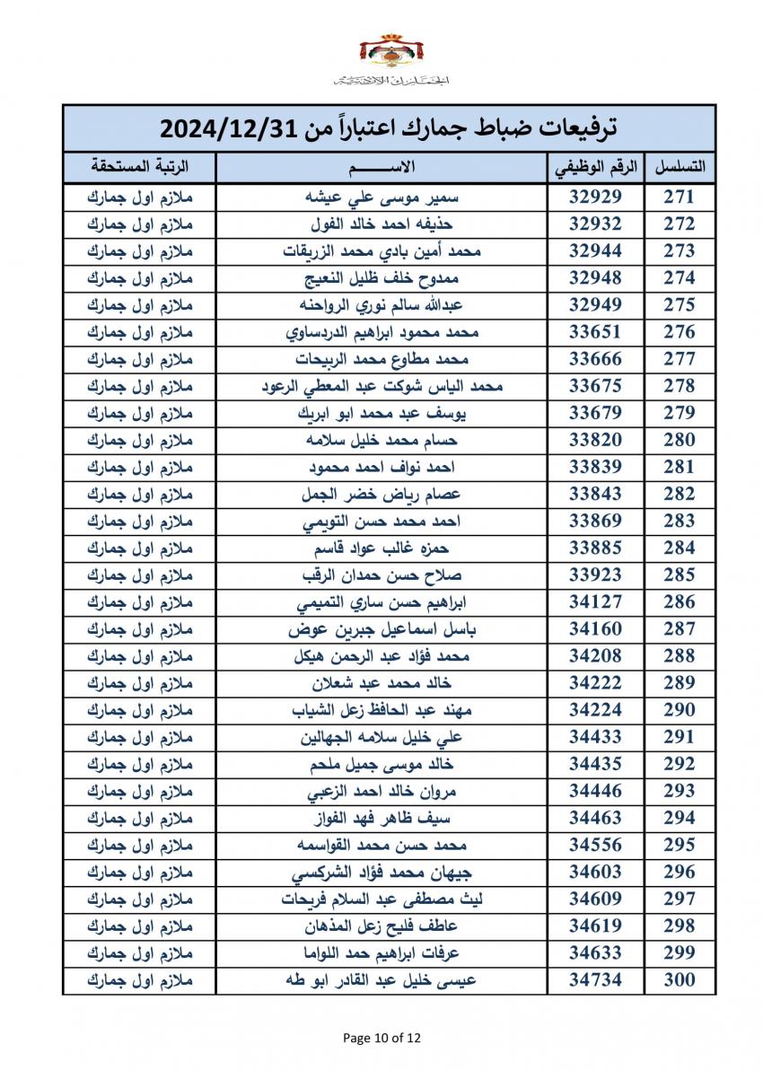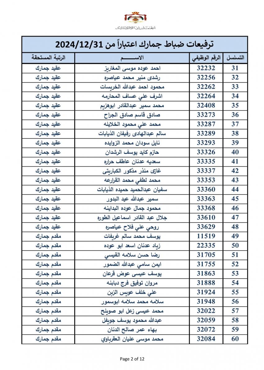 سرايا - أعلنت دائرة الجمارك الأردنية مساء اليوم الخميس، ترفيع 340 ضابطا، وعدد من ضباط الصف والافراد.