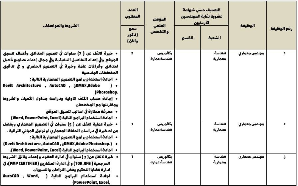 سرايا - تعلن أمانة عمان الكبرى عن حاجتها لتعيين بوظيفة مهندس معماري بموجب عقد شامل لجميع العلاوات.
