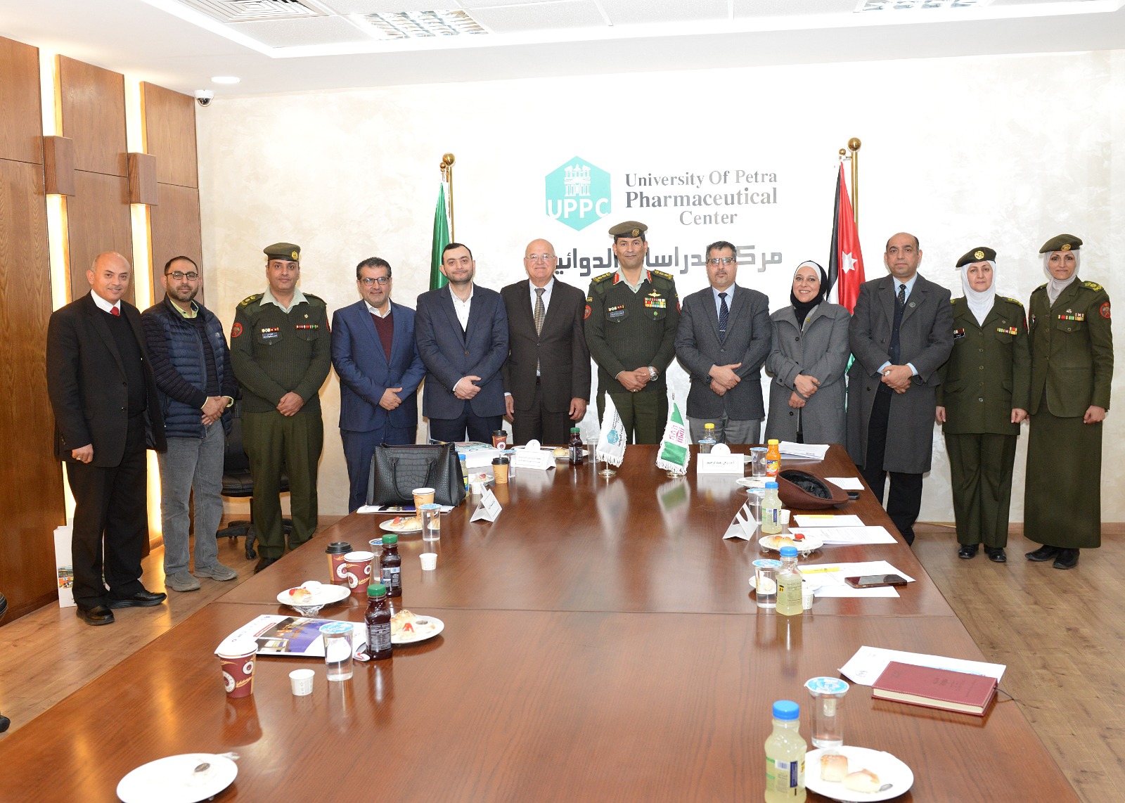 وضم وفد الجامعة نائب الرئيس الدكتور مياس الريماوي، وعميد كلية الصيدلة الدكتور رياض عوض، ورئيس قسم التغذية الدكتور عمر الحاج، ورئيس قسم الكيمياء الدكتور عبد المنعم طويق، ومدير مركز الدراسات الدوائية الدكتور نضال القنة، ورئيس قسم التحاليل الطبية الدكتور لؤي أبو قطوسة، ومنسقة الاتفاقيات في كلية الصيدلة الدكتورة آية طلال الكيلاني، ومدير العلاقات العامة السيد علاء الدين عربيات، في حين ضم وفد القوات المسلحة المقدم المهندس أحمد الدعجة، والمقدم المهندسة كفى الصرايرة، والمقدم المهندسة أروى الحمايدة.