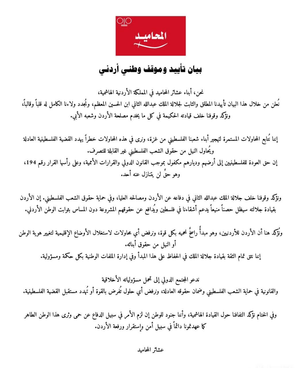 نُعلن من خلال هذا البيان تأييدنا المطلق والثابت لجلالة الملك عبدالله الثاني ابن الحسين المعظم، ونُجدد ولاءنا الكامل له قلباً وقالباً،