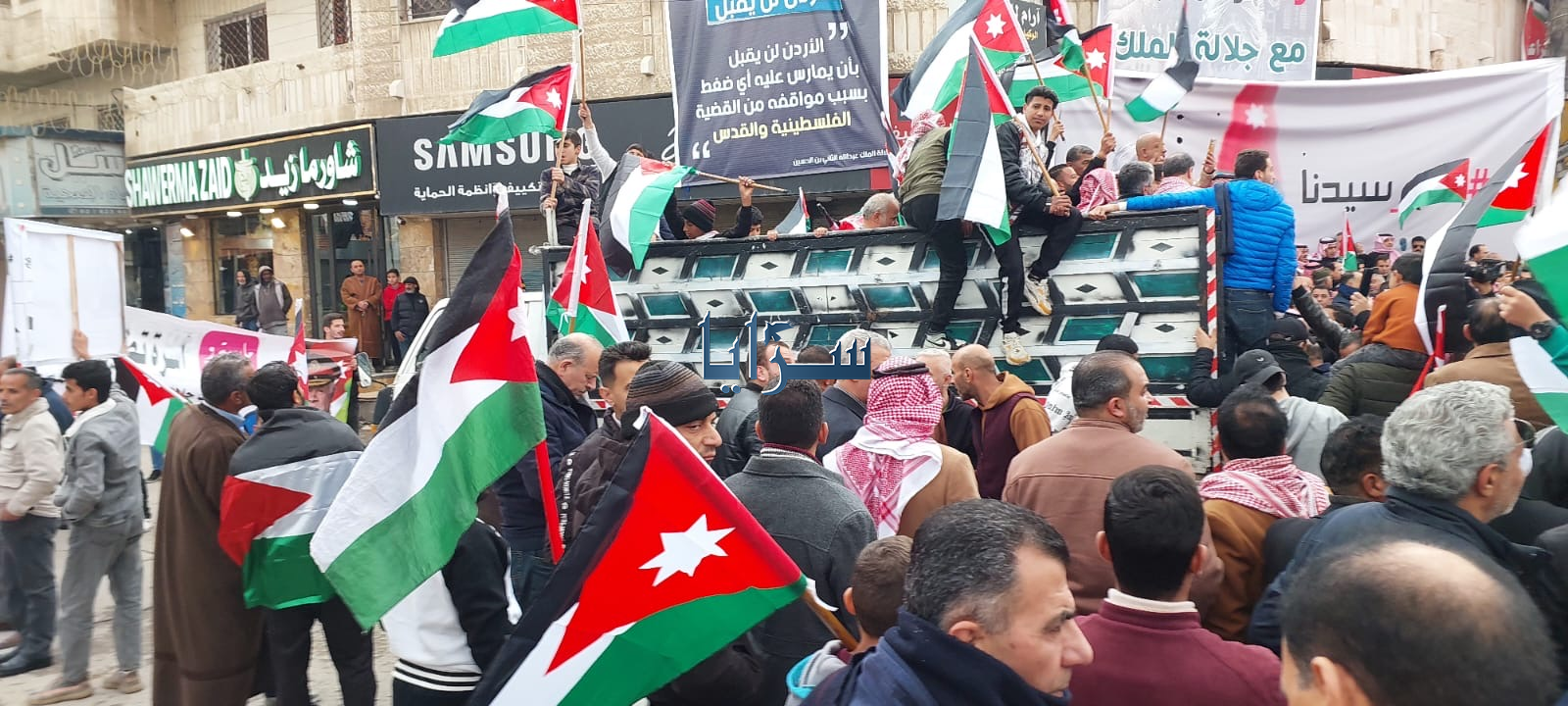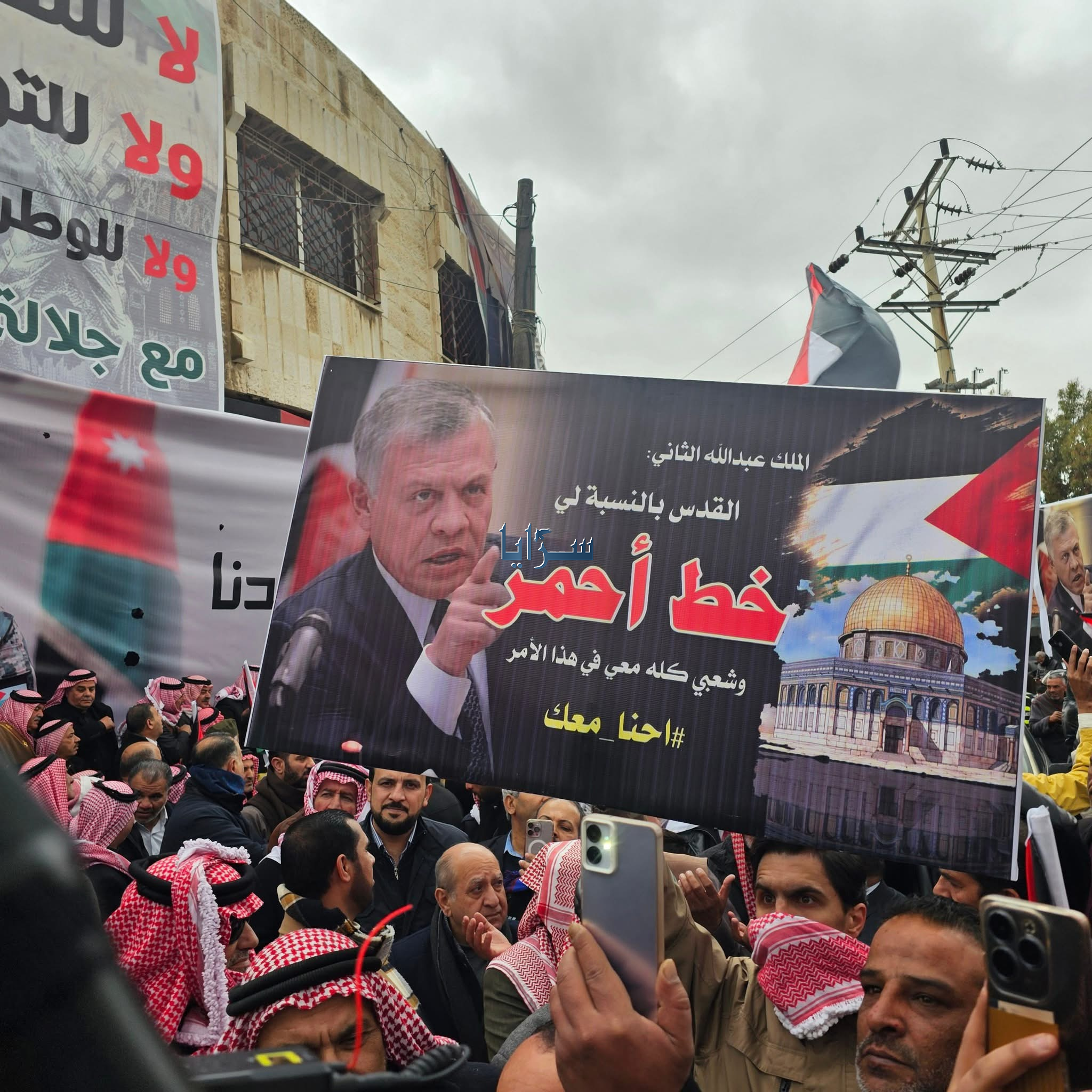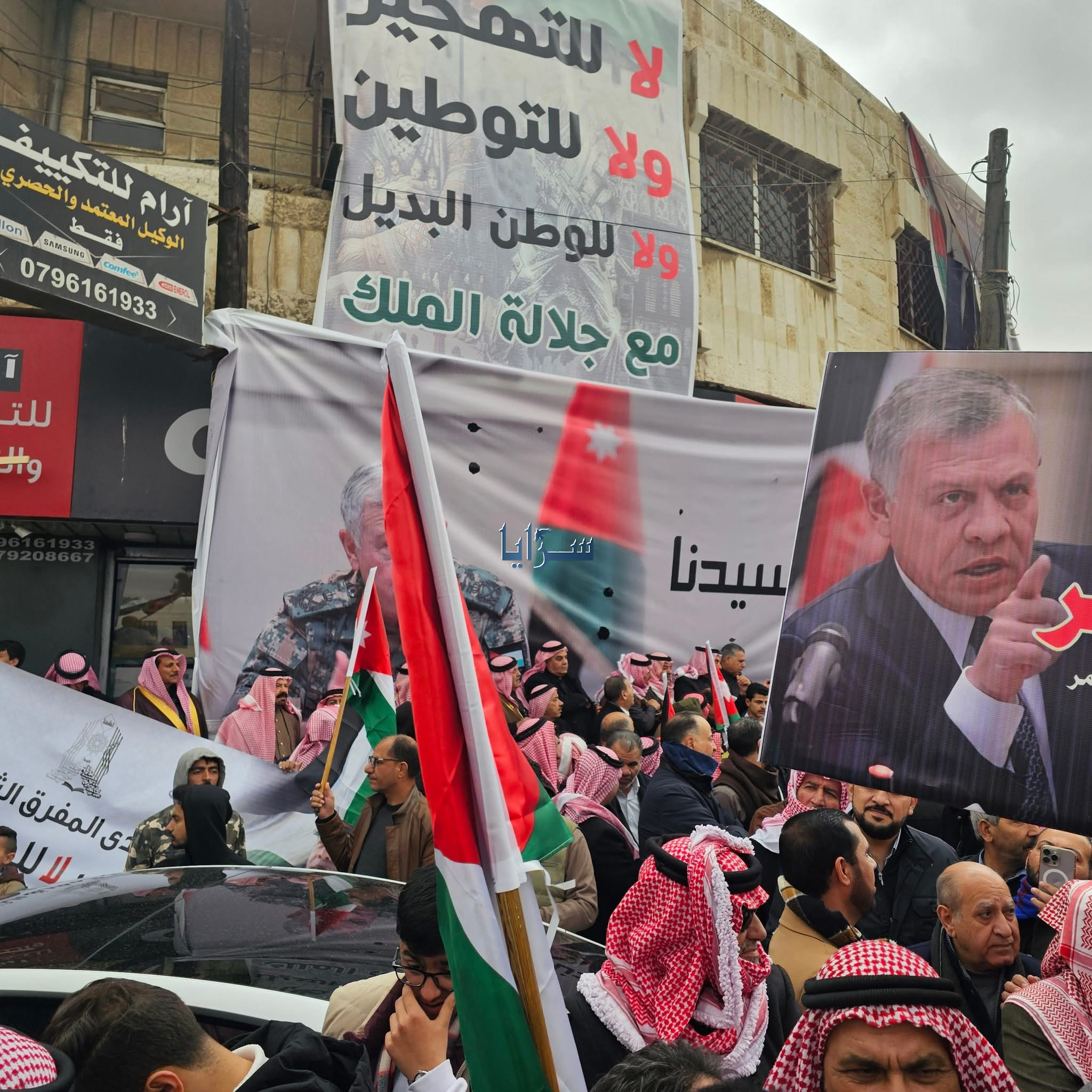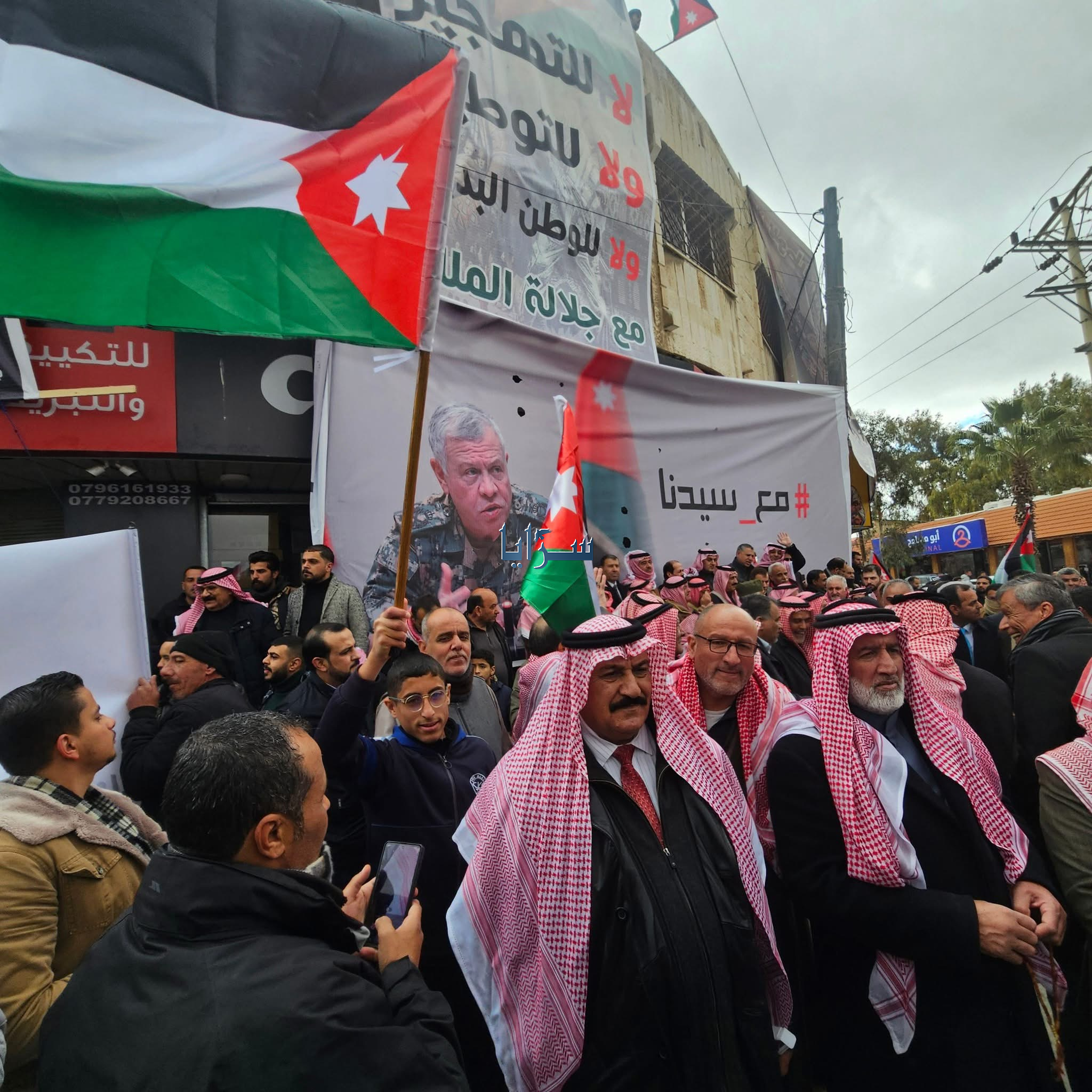 سرايا - المفرق - رهام الخزاعلة - شهدت محافظة المفرق، اليوم، وقفة جماهيرية حاشدة ضمّت فعاليات شعبية وحزبية ونقابية وعشائرية، دعماً لموقف جلالة الملك عبدالله الثاني الرافض لمشاريع التهجير والوطن البديل.