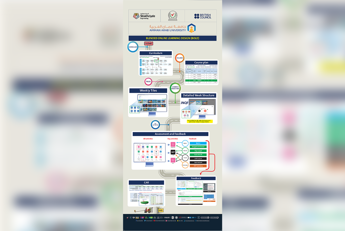 وانطلق المشروع بفعالية افتتاحية ناجحة في عمان / المملكة الأردنية الهاشمية بحضور رئيس هيئة اعتماد مؤسسات التعليم العالي وضمان جودتها الأستاذ الدكتور ظافر الصرايرة، ومدير المجلس البريطاني في الأردن Alex Lambert إلى جانب أكثر من (100) مشارك من ممثلي الجامعات الأردنية، حيث استمرت فعاليات المشروع خلال الفترة من يونيو إلى سبتمبر 2024 من خلال (6) ورش تدريبية عبر الإنترنت، ركزت على تعريف المشاركين بنهج التعلم المدمج والتعلم عبر الإنترنت (BOLD)، مع تنفيذ أنشطة عملية تهدف إلى تعزيز مهاراتهم في تصميم المناهج الدراسية، واختُتمت هذه المرحلة في 18 نوفمبر 2024 بحفل ختامي تم خلاله تسليم الشهادات للمشاركين.