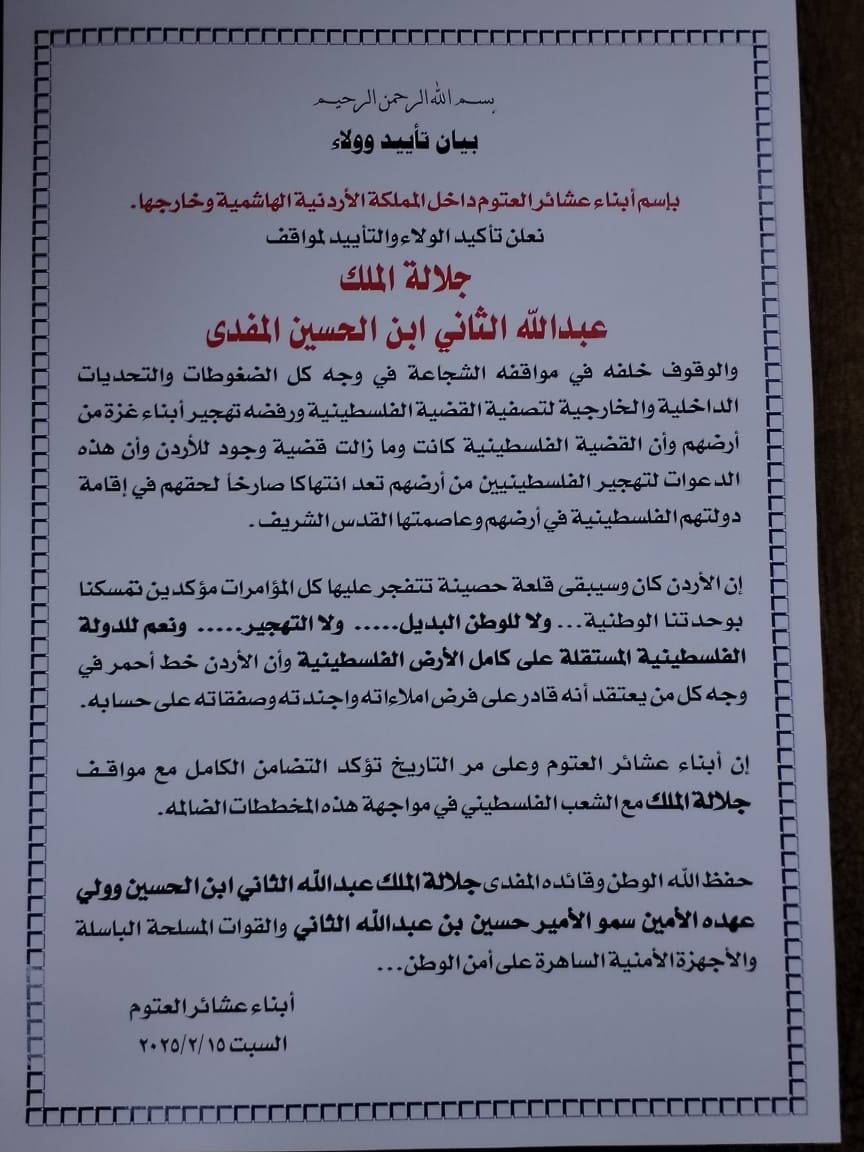 و بين أبناء عشيرة العتوم انهم يجددون البيعة و العهد للملك عبدالله الثاني ابن الحسين المعظم حفظة الله ورعاه مؤكدين على دعمهم لمواقف جلالته من القضية الأولى (القضية الفلسطينية)
