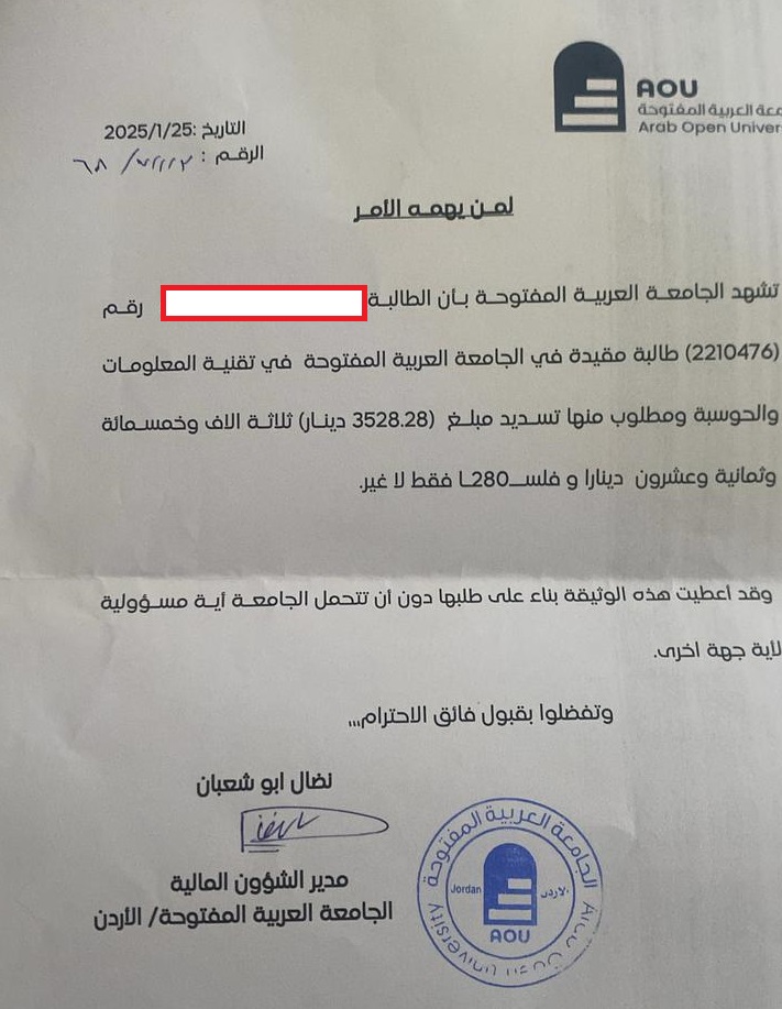 لكن هذا الحلم بات مهددًا بالضياع، حيث تواجه الطالبة الأردنية صعوبة في تأمين رسومها الجامعية البالغة 2930 دينارًا، مما قد يحرمها من التسجيل في الفصل الدراسي القادم ويقطع طريقها نحو التخرج.