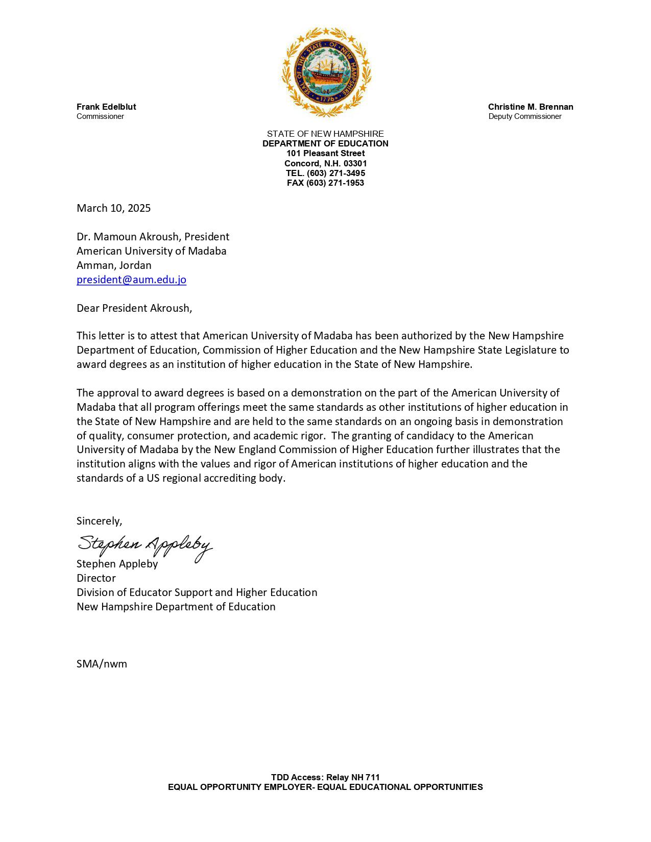 الجامعة الأميركية في مادبا تتلقى تأكيدًا رسميًا على ترخيصها الأكاديمي في نيو هامشير