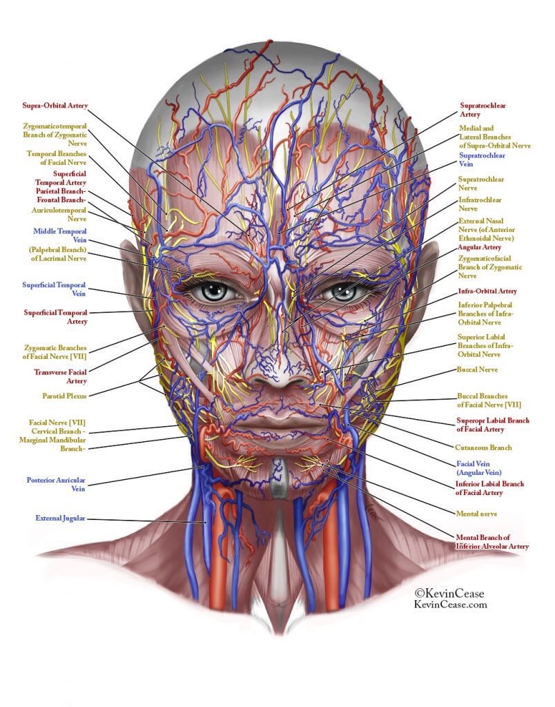 لكن اذا ألقيت نظرة دقيقة على تشريح الأوعية الدموية بمنطقة الوجه لعلمت لمَ هو شائع وغير مستغرب حدوث بعض الكدمات بعد الحقن ، والاهم من ذلك: لم يجب على طبيبك ان يلم بعلم التشريح قبل ان يقوم بمهمة الحقن !