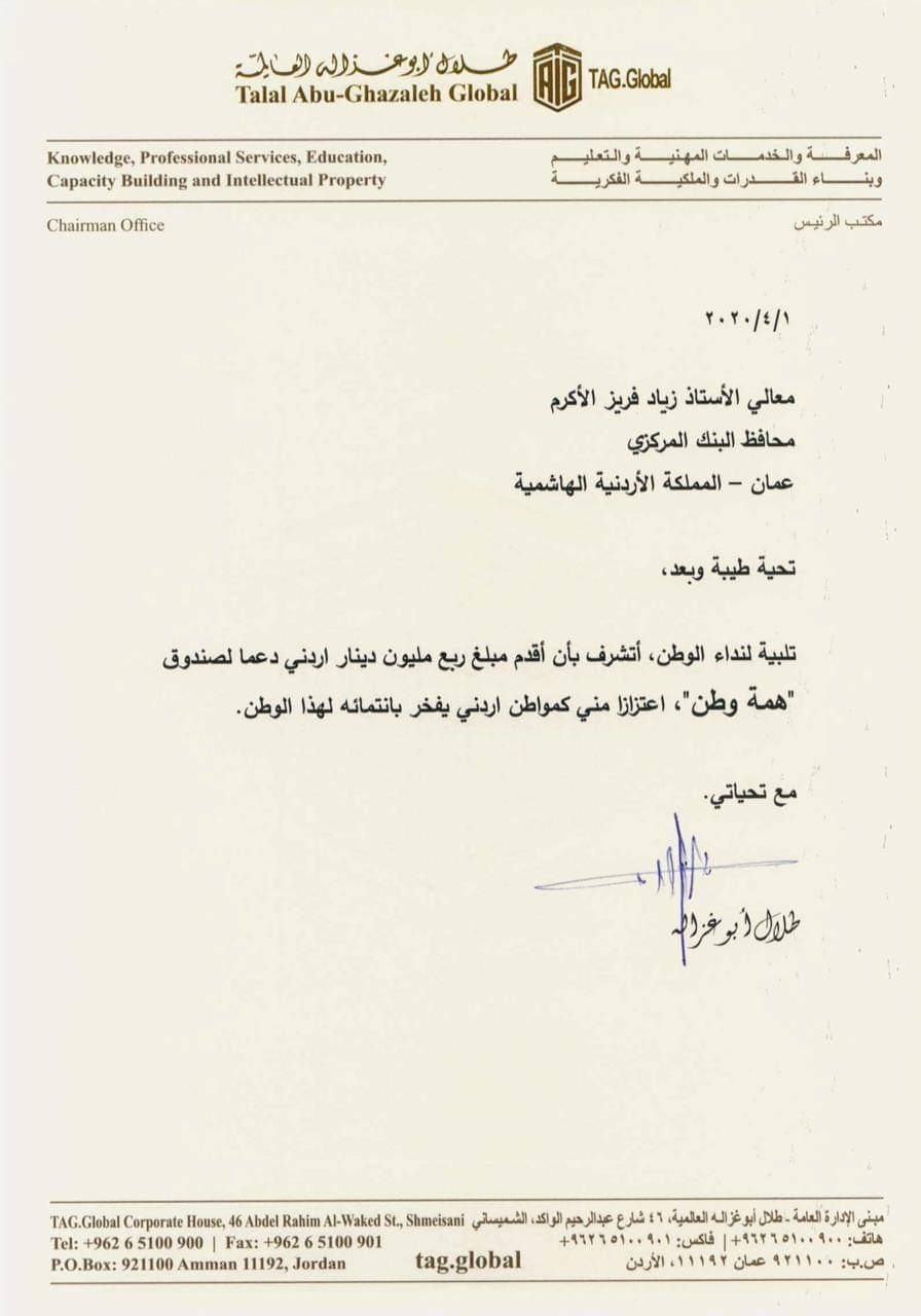 سرايا - تقدم رجل الأعمال الأردني طلال أبو غزالة، بتبرعات نقدية لصندوق "همة وطن"، وقدم أبو غزالة مبلغ قيمته ربع مليون دينار كدعم لجهود الحكومة في مواجهة فيروس كورونا.